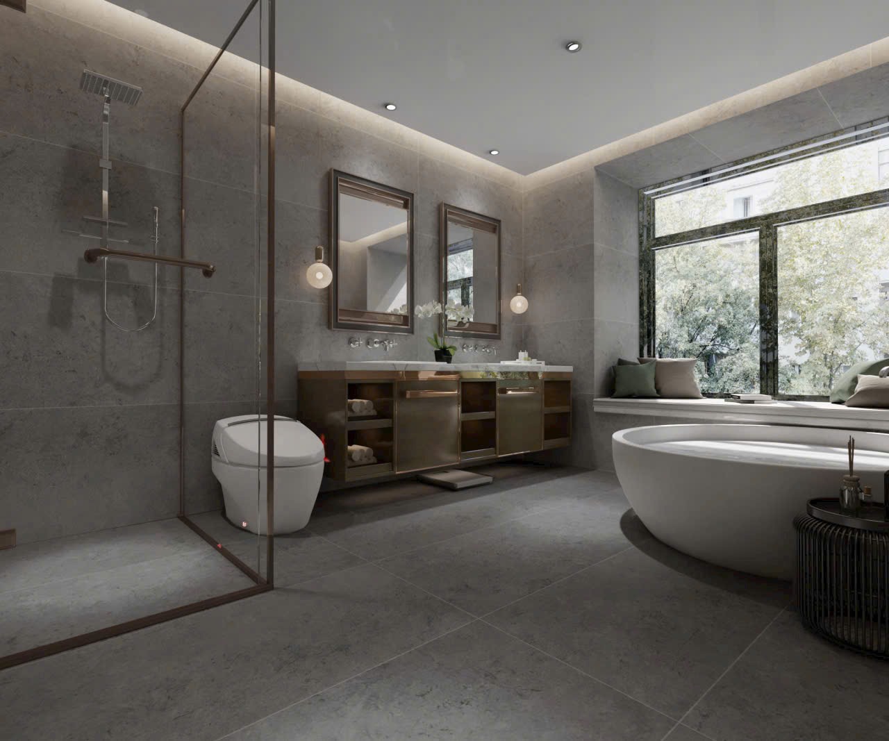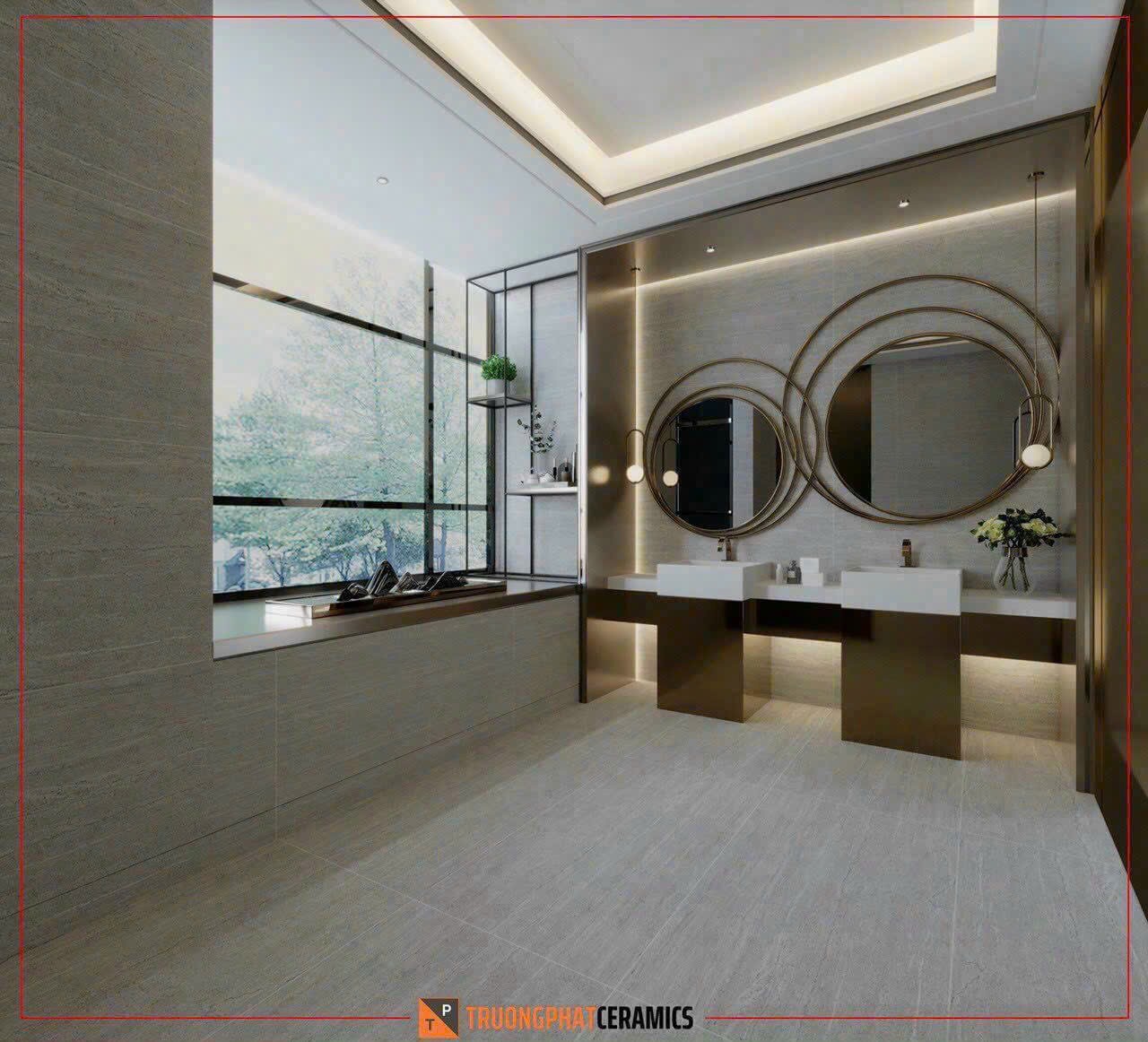 Mang vẻ đẹp tự nhiên, mạnh mẽ và sang trọng. Các tông màu phổ biến như xám, be, trắng vân mây rất được ưa chuộng cho WC cao cấp.