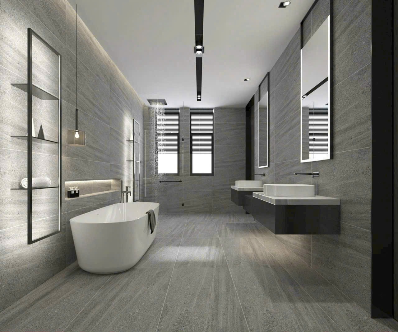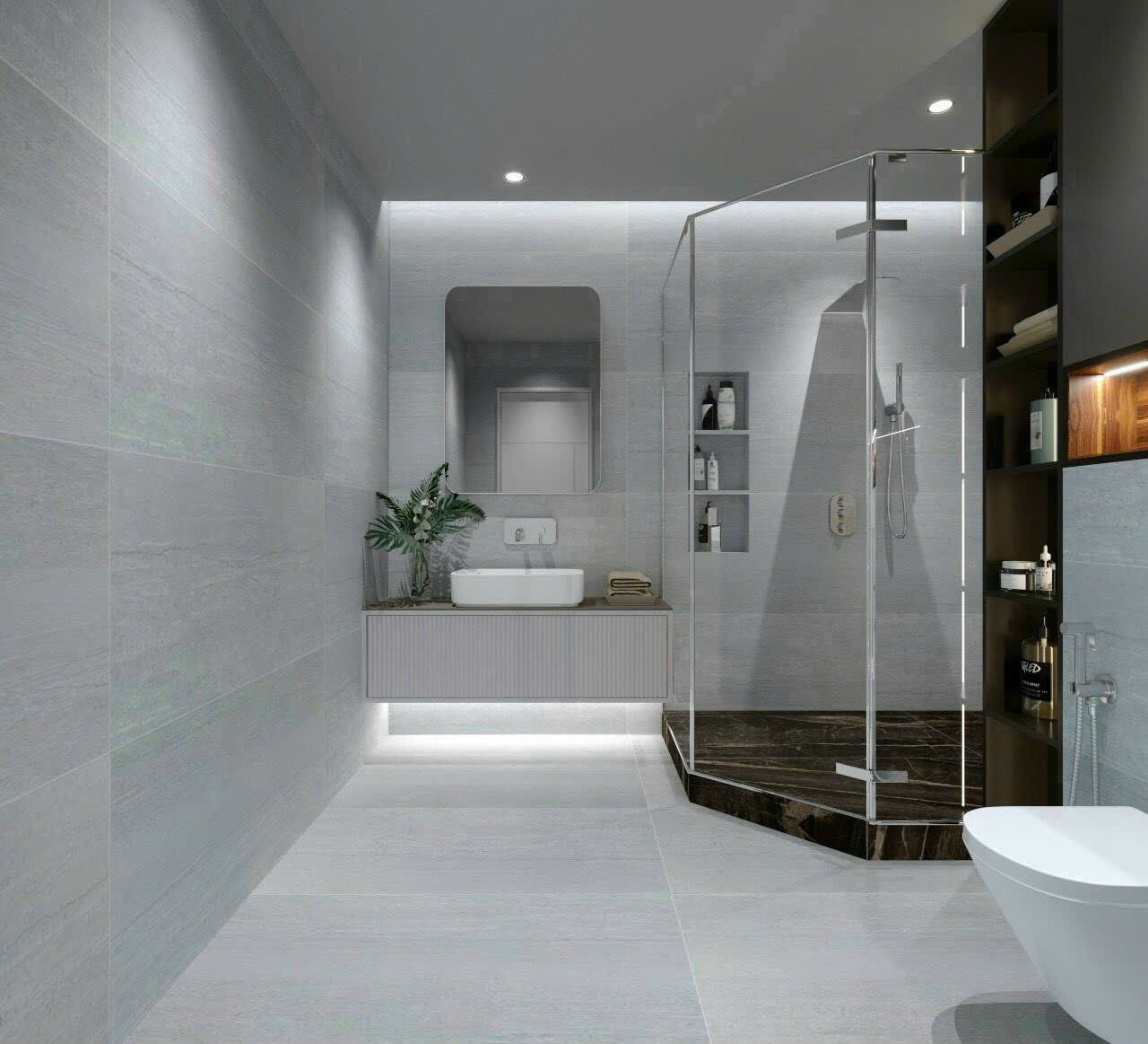 Kết hợp màu gạch với thiết bị vệ sinh và ánh sáng để không gian hài hòa, thoáng đãng.
